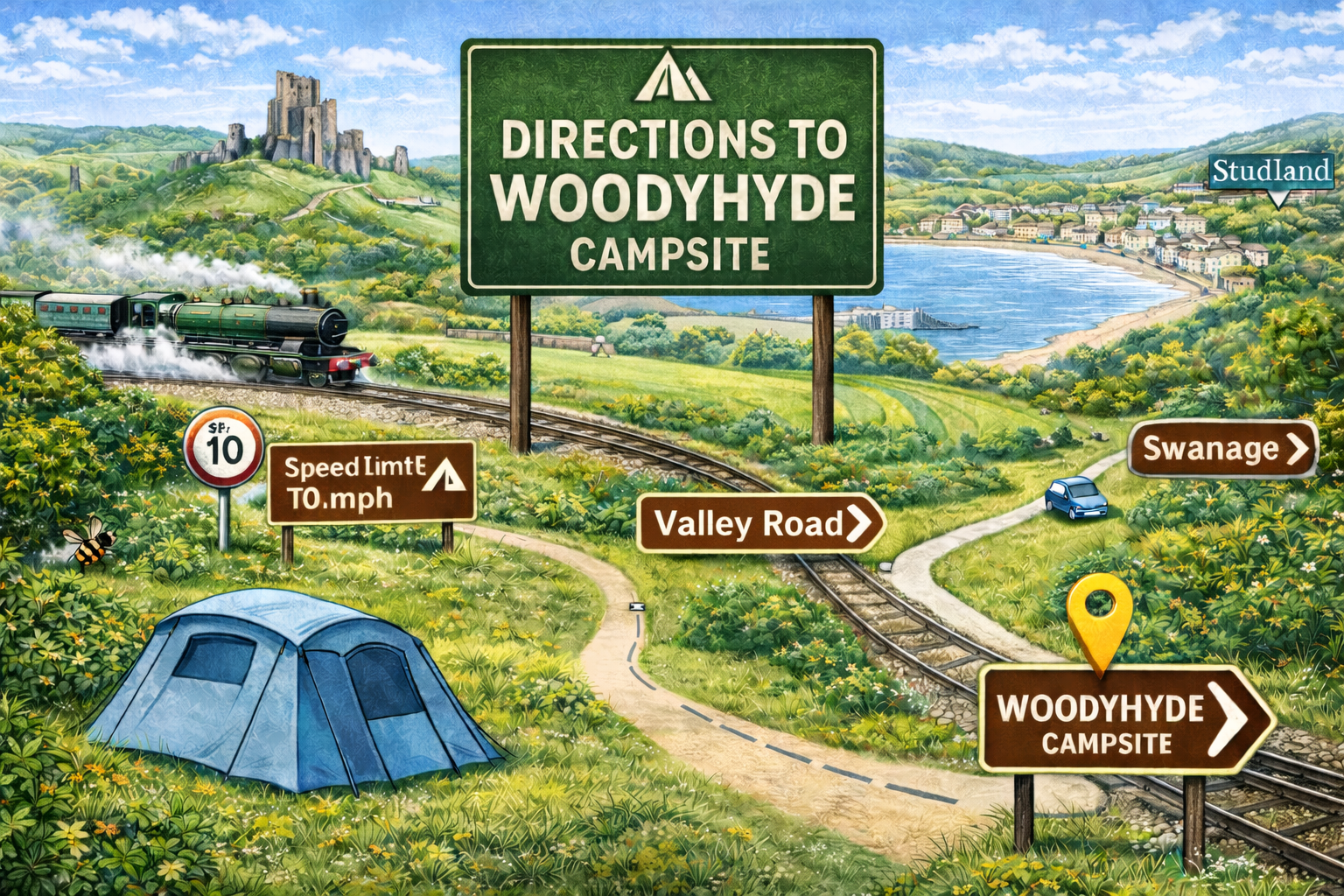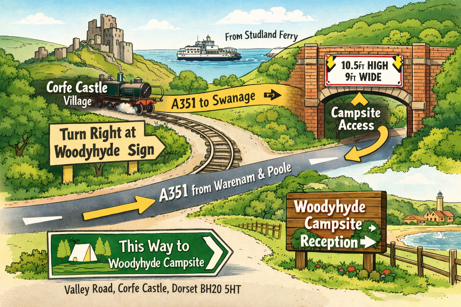 - From the village of Corfe Castle, continue on the A351 towards Swanage. Approximately one mile outside Corfe Castle, look out for the Woodyhyde Campsite sign and turn right. Follow the track past the cottages, go under the railway bridge, and reception is located in the first field on the left.